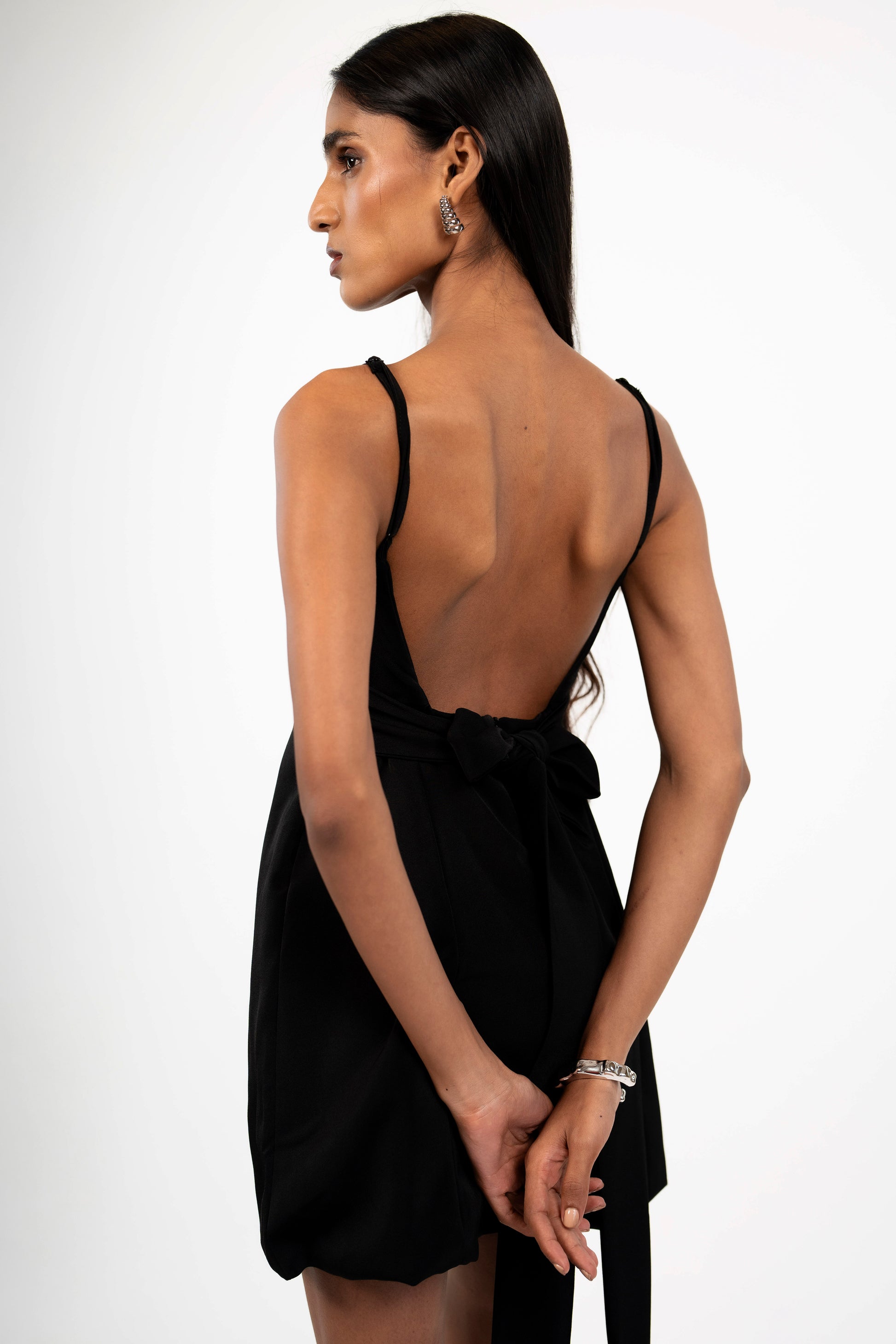 Short dress made in poly viscose fabric. Straight neckline and thin straps. Bow detail at the back. Inner lining. Back fastening with concealed zip in the seam.