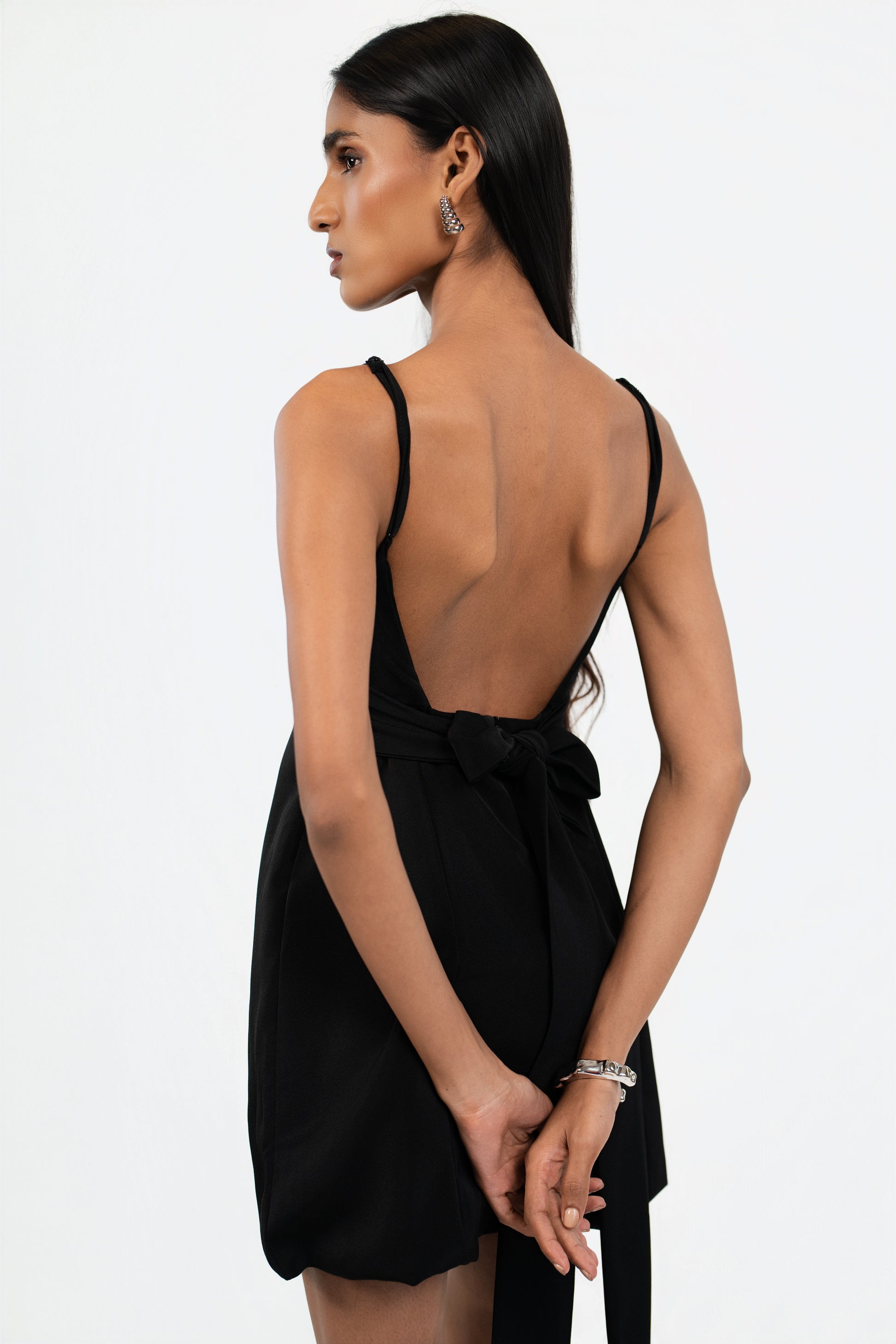 Short dress made in poly viscose fabric. Straight neckline and thin straps. Bow detail at the back. Inner lining. Back fastening with concealed zip in the seam.