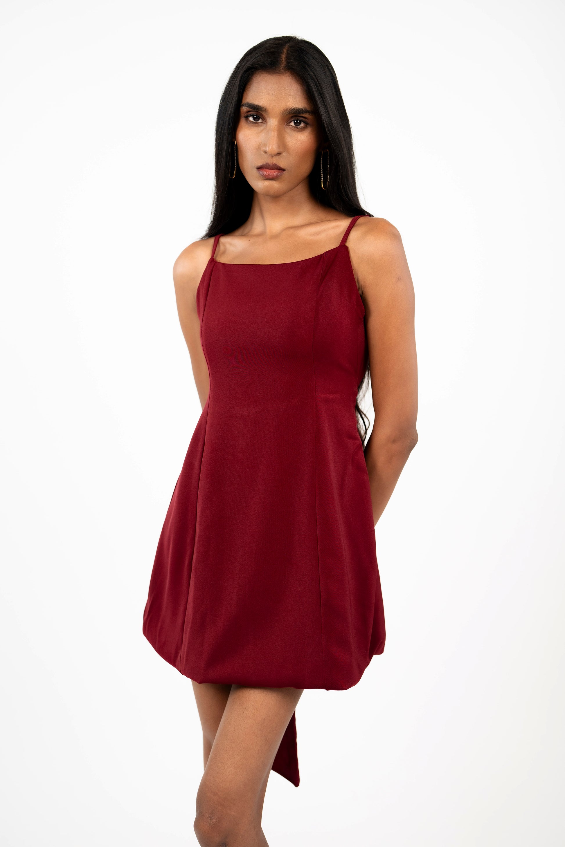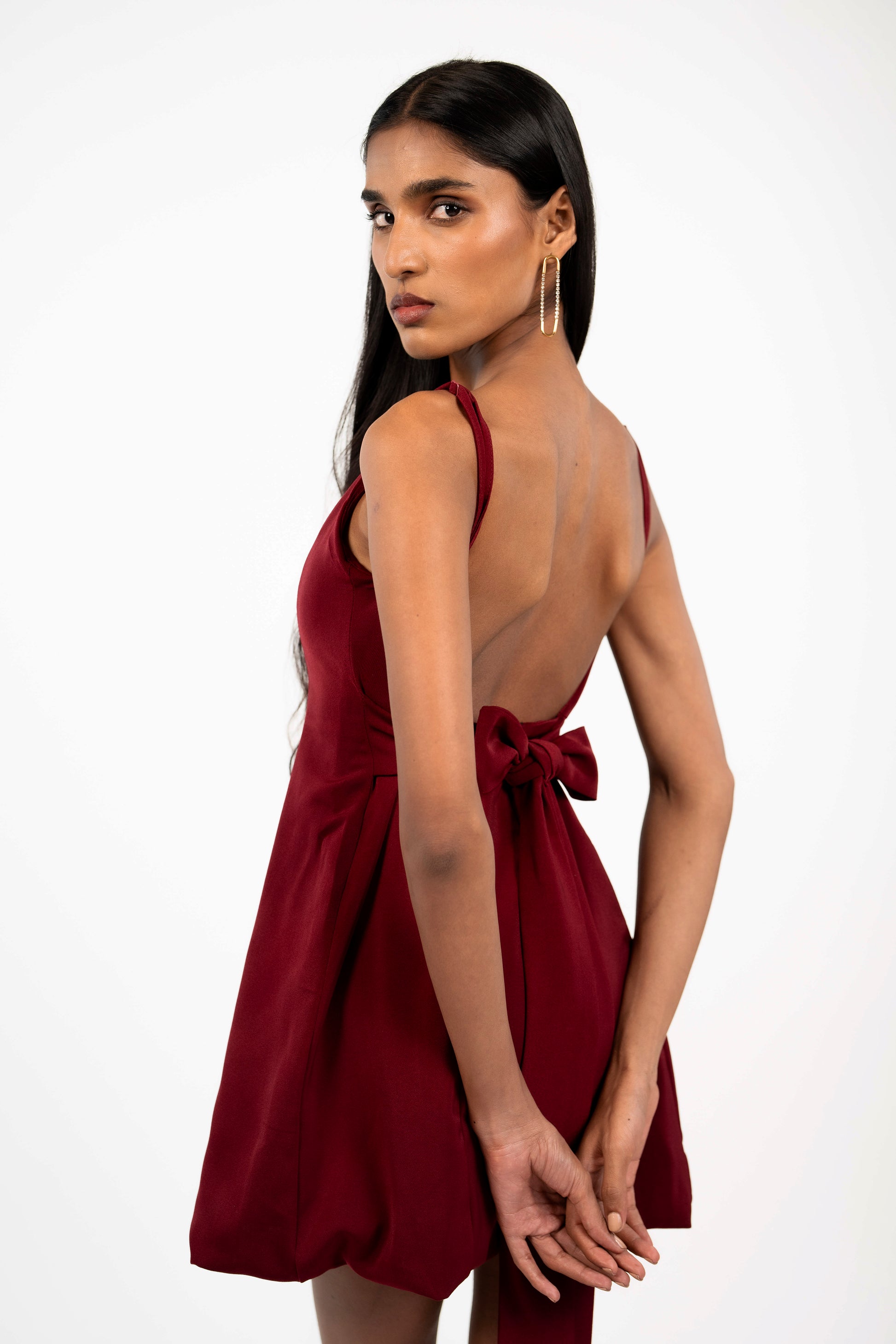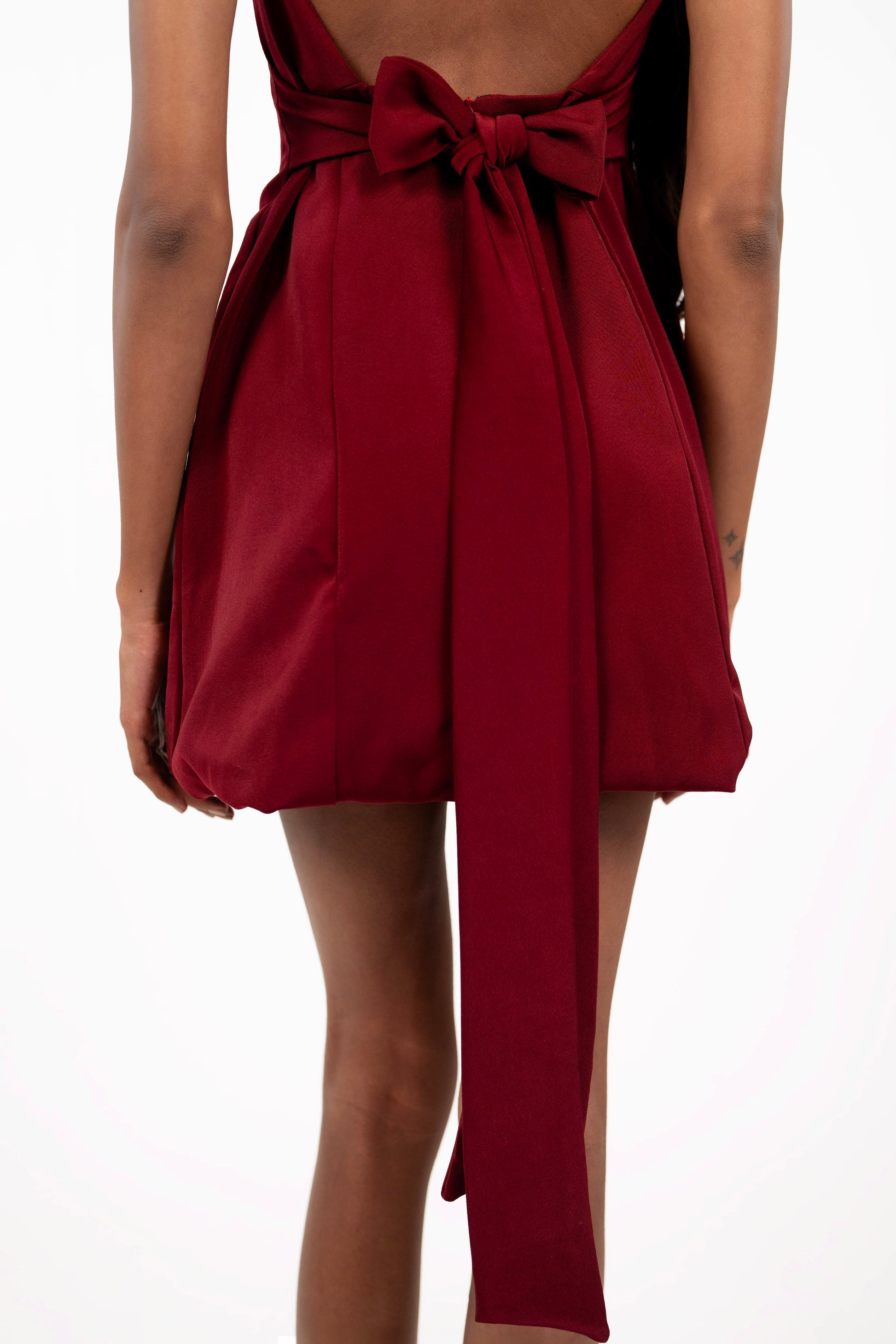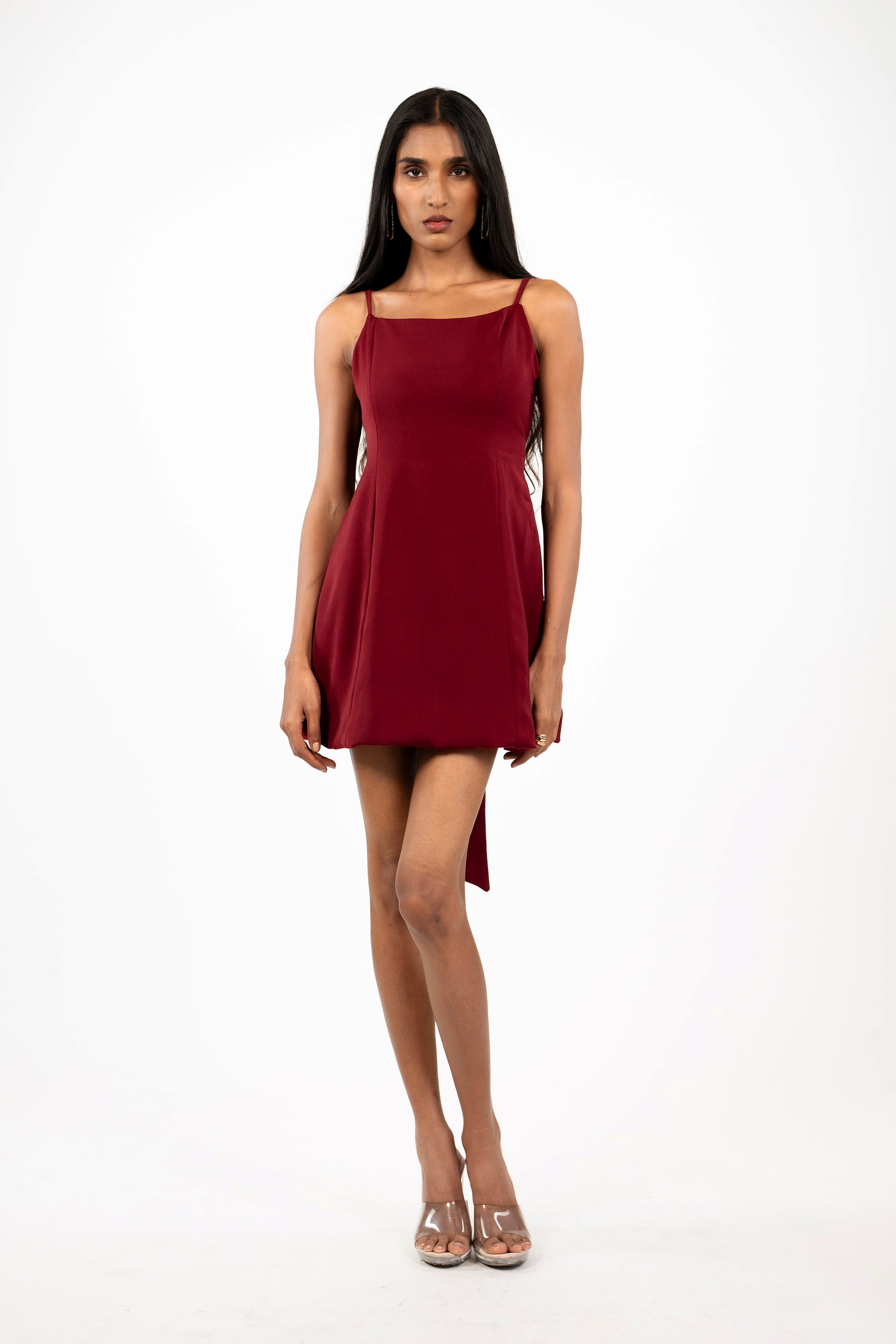 Short dress made in poly viscose fabric. Straight neckline and thin straps. Bow detail at the back. Inner lining. Back fastening with concealed zip in the seam.