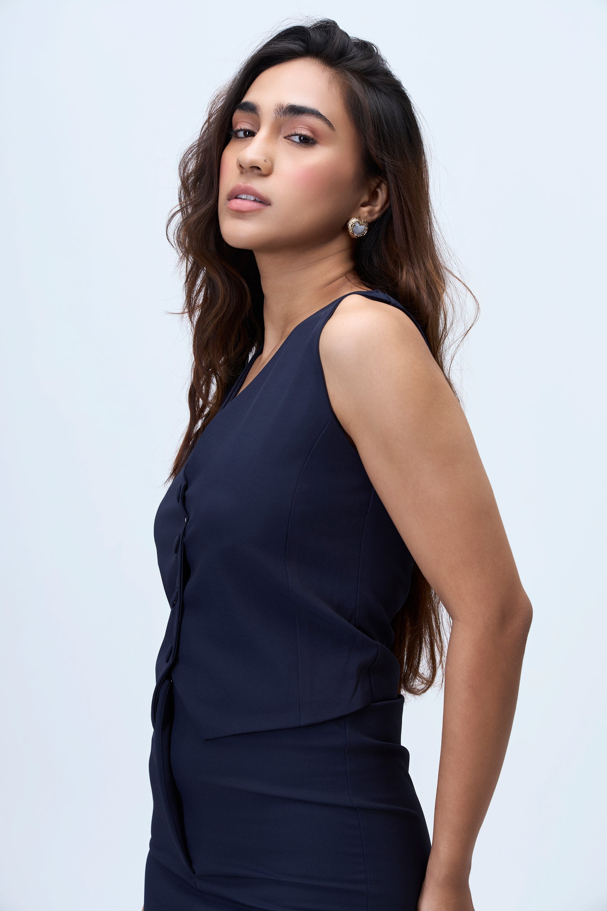 High-rise tailored trousers with a flattering flared hem. Featuring a sleek front seam detail, zip closure, and a form-fitting silhouette that elongates the legs. Perfect for elevating both workwear and smart-casual looks, with effortlessly stylish, this sleeveless waistcoat boasts a sleek, contemporary silhouette with subtle structured detailing. Crafted for versatility, its clean lines and understated elegance make it a must-have for transitioning from day to night.