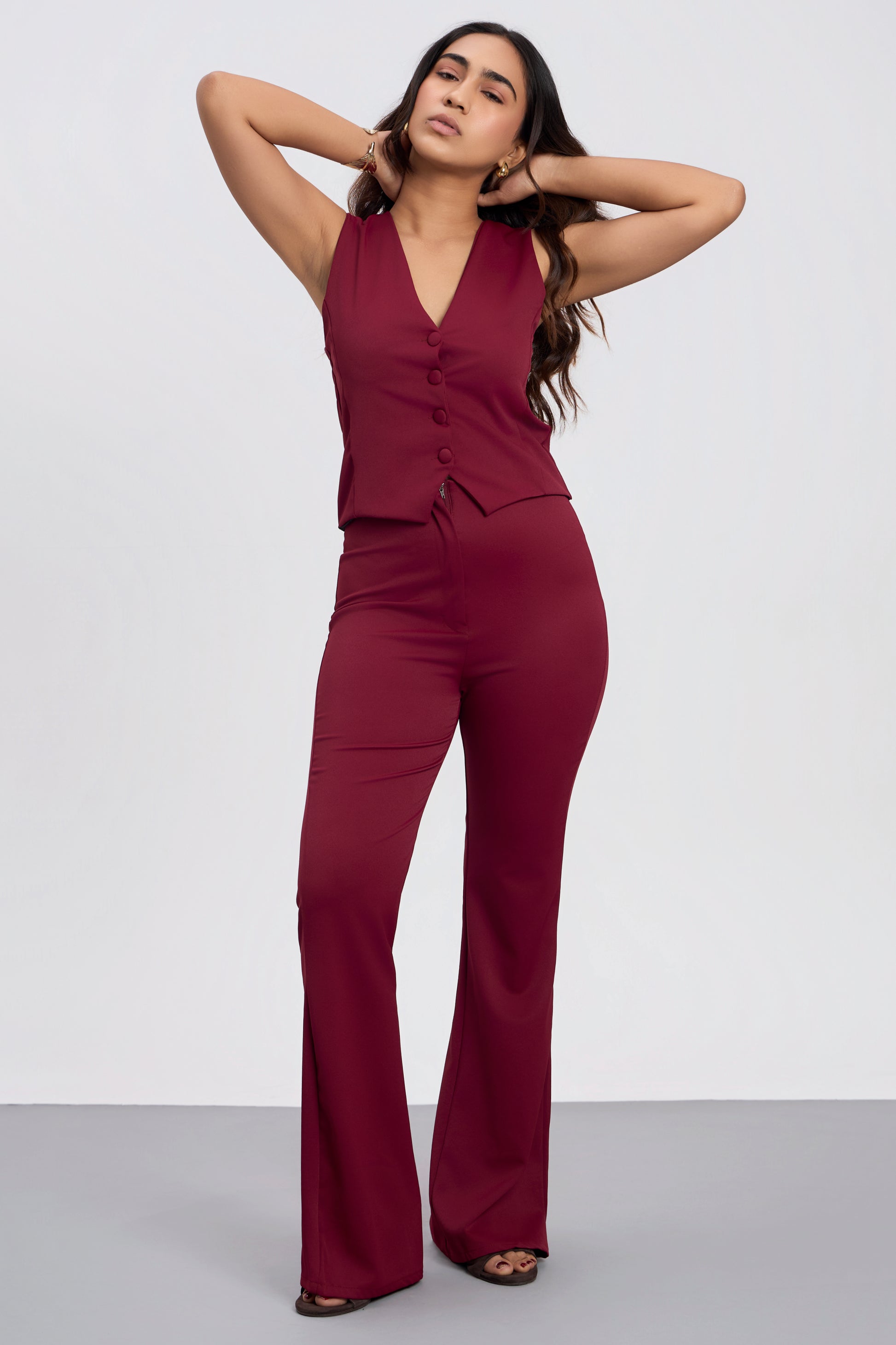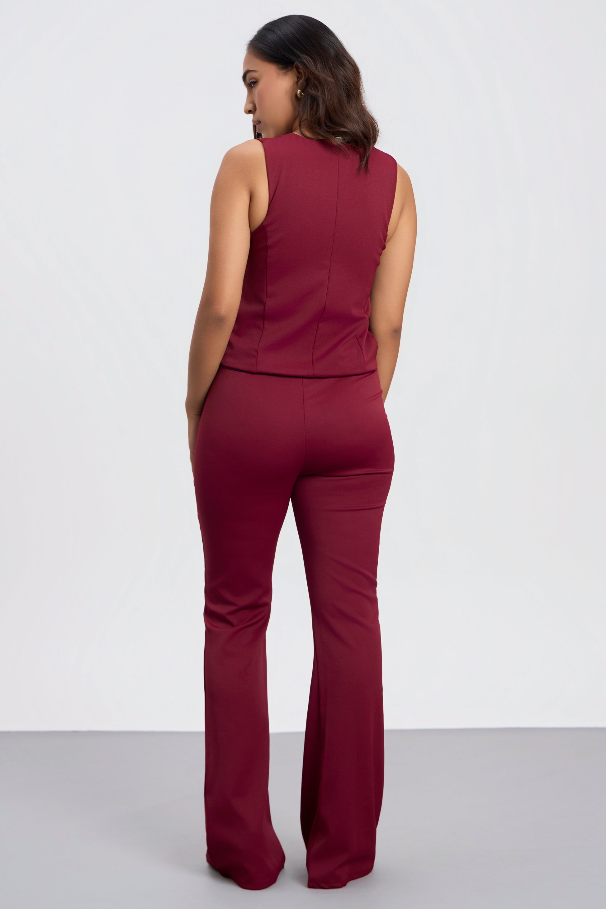 High-rise tailored trousers with a flattering flared hem. Featuring a sleek front seam detail, zip closure, and a form-fitting silhouette that elongates the legs. Perfect for elevating both workwear and smart-casual looks & Effortlessly stylish, this sleeveless waistcoat boasts a sleek, contemporary silhouette with subtle structured detailing. Crafted for versatility, its clean lines and understated elegance make it a must-have for transitioning from day to night.