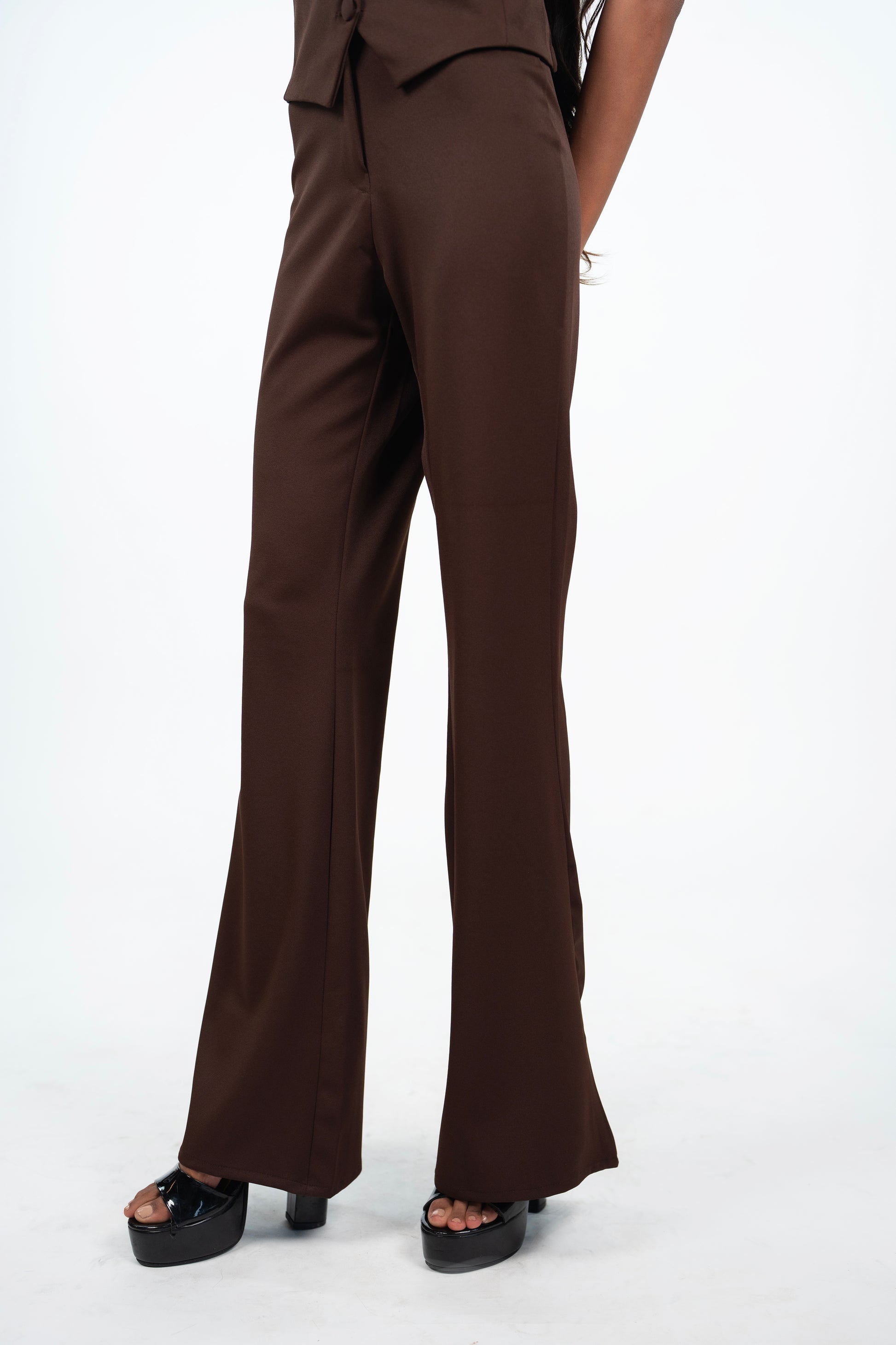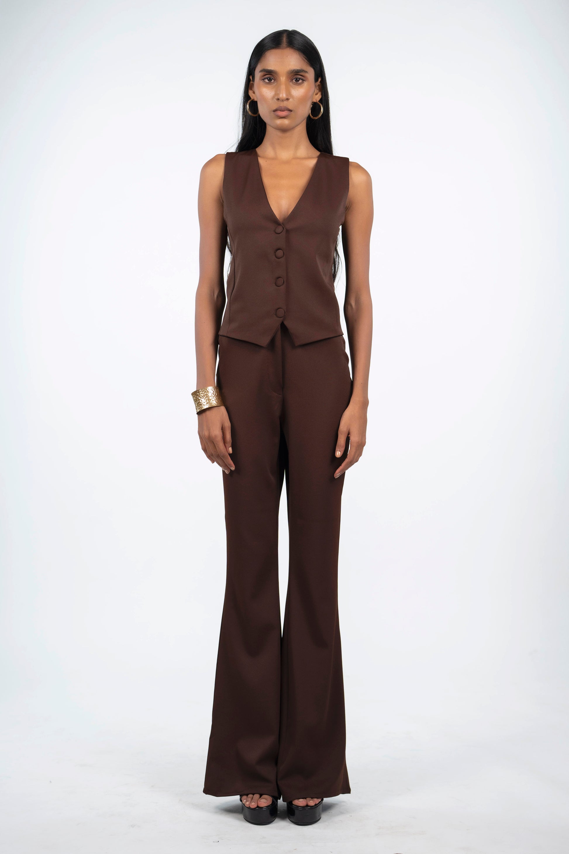 High-rise tailored trousers with a flattering flared hem. Featuring a sleek front seam detail, zip closure, and a form-fitting silhouette that elongates the legs. Perfect for elevating both workwear and smart-casual looks, with effortlessly stylish, this sleeveless waistcoat boasts a sleek, contemporary silhouette with subtle structured detailing. Crafted for versatility, its clean lines and understated elegance make it a must-have for transitioning from day to night.