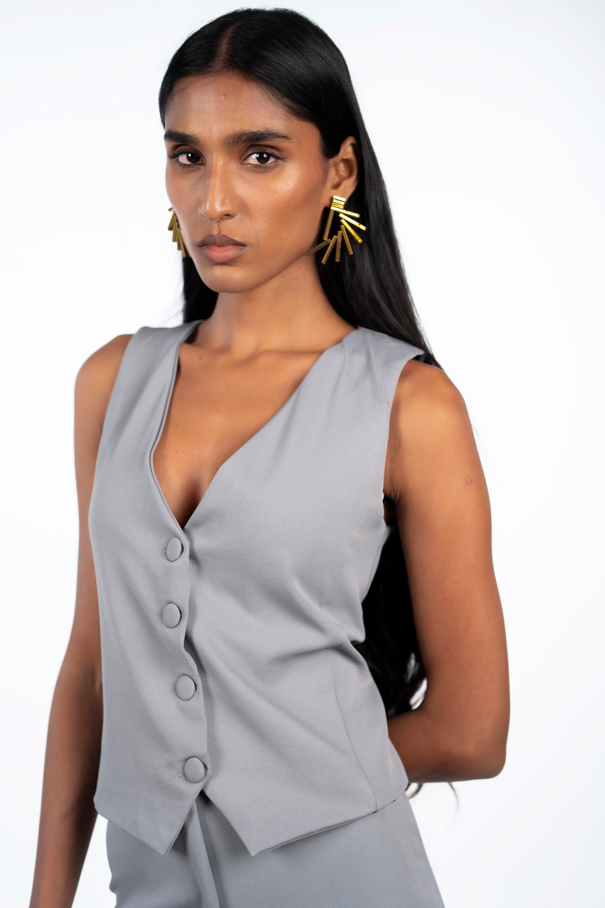 High-rise tailored trousers with a flattering flared hem. Featuring a sleek front seam detail, zip closure, and a form-fitting silhouette that elongates the legs. Perfect for elevating both workwear and smart-casual looks, with effortlessly stylish, this sleeveless waistcoat boasts a sleek, contemporary silhouette with subtle structured detailing. Crafted for versatility, its clean lines and understated elegance make it a must-have for transitioning from day to night.