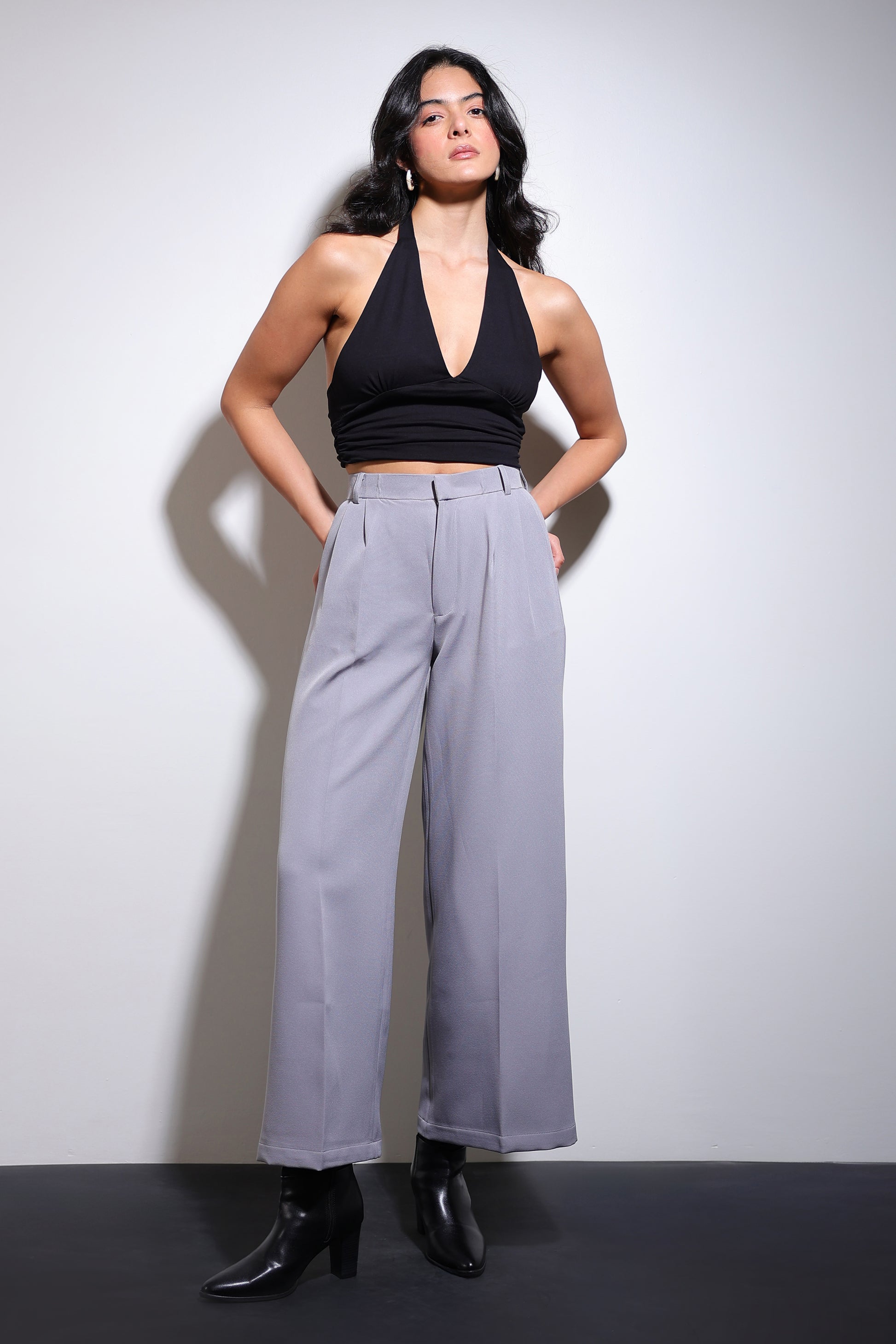 High-waist trousers with a clean waistband and wide flared leg silhouette, in smooth fluid fabric.