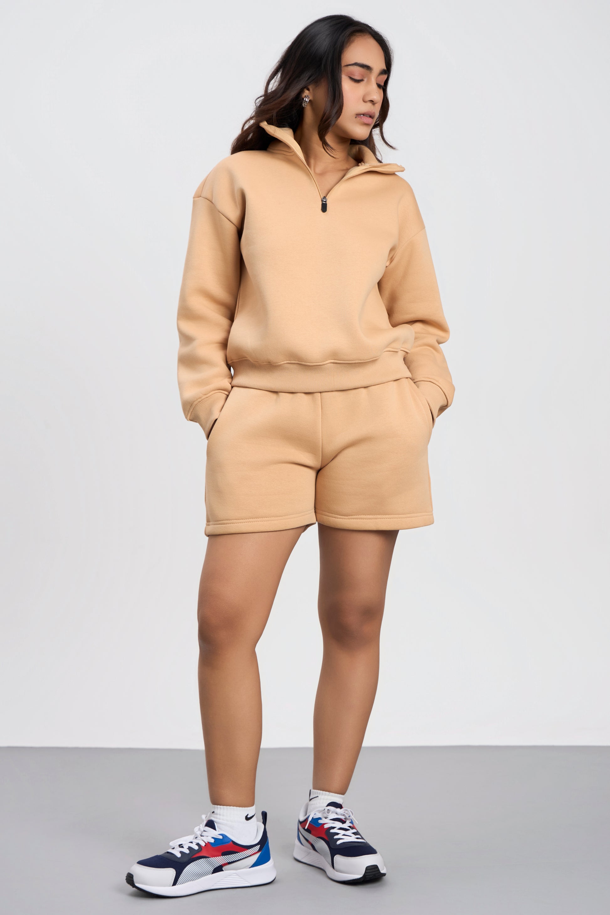Soft oversized sweatshirt crafted from premium cotton fleece. Features a high stand collar with a half-zip closure and dropped shoulders for a laid-back silhouette. Ribbed cuffs and hem add subtle structure. Minimal, elevated, and designed for effortless layering.