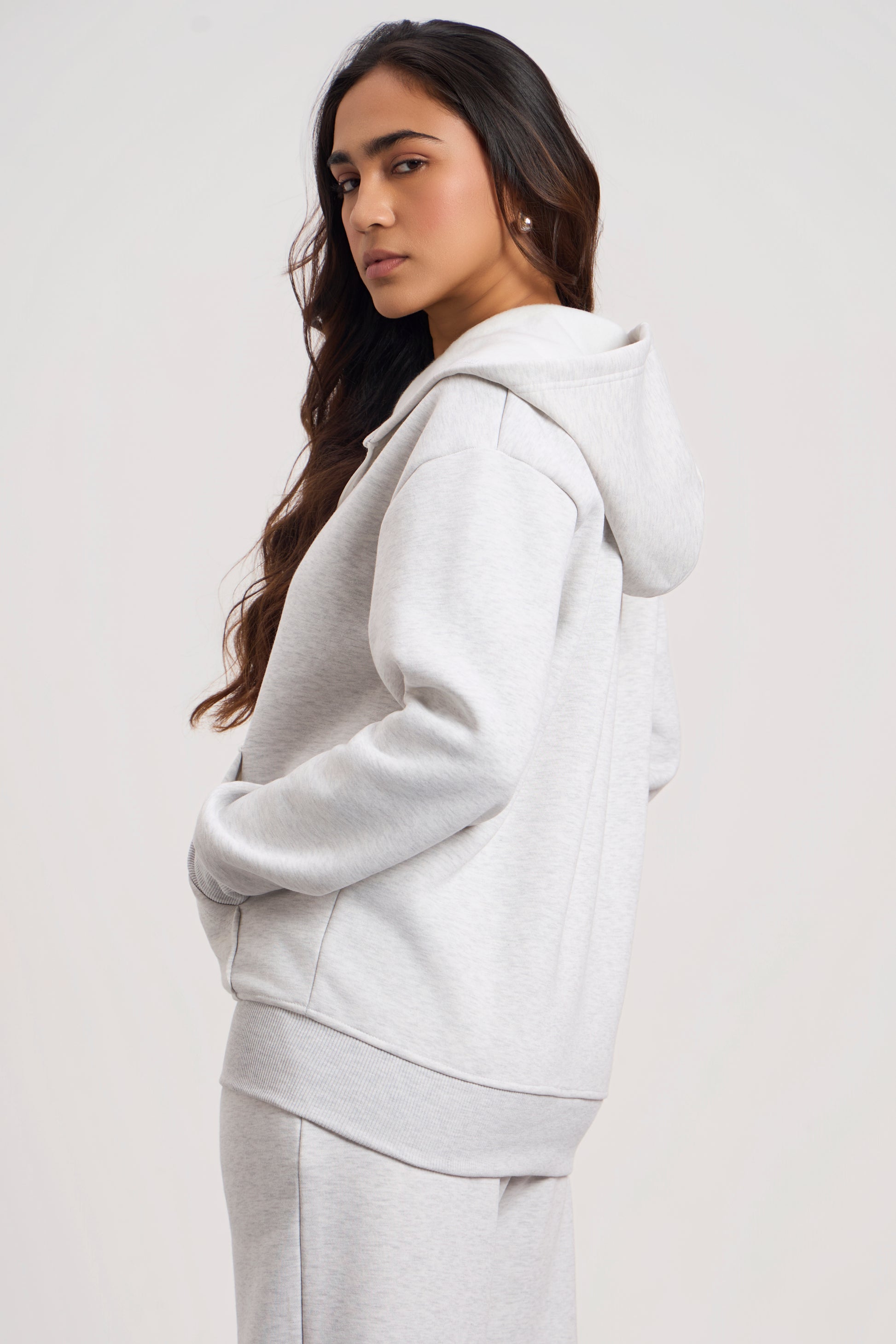 Zipperin soft cotton terry. Loose fit and dropped shoulders.