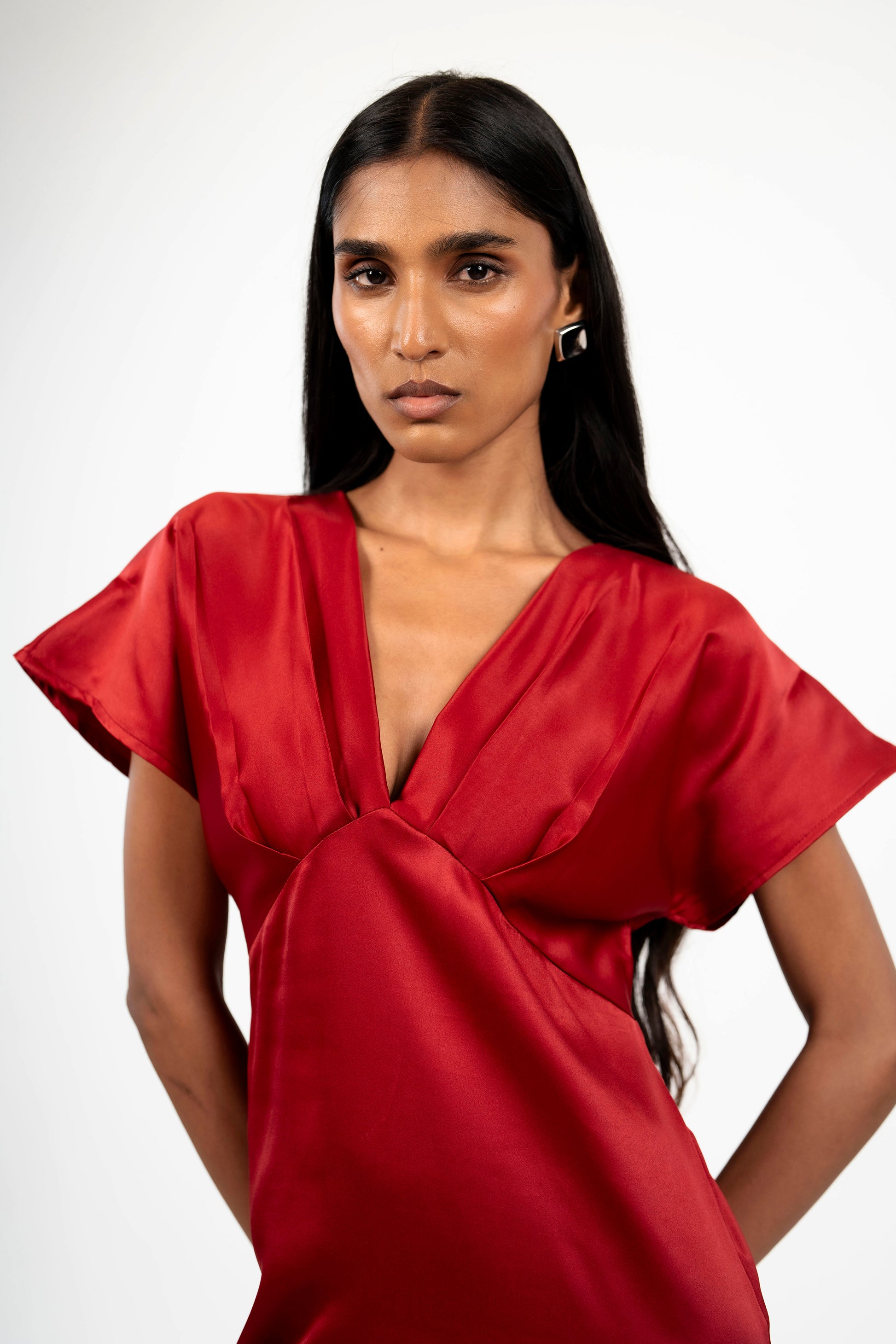 V-neck dress with pleats and short sleeves. Fitted waist. Concealed side zip fastening.
