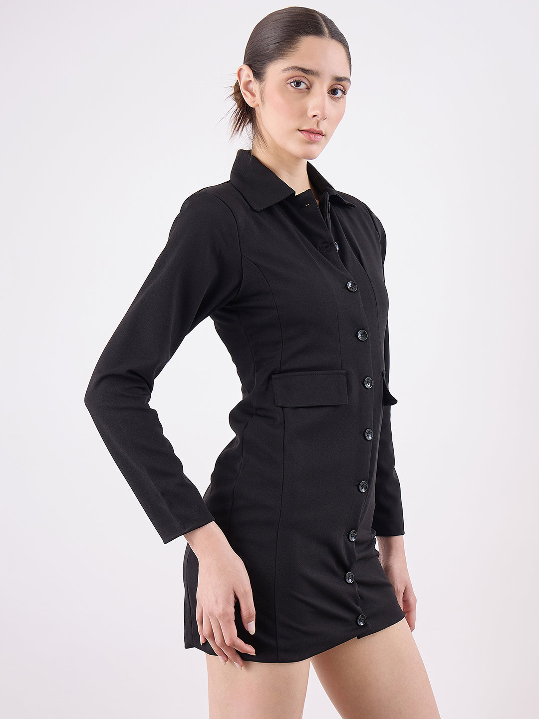 Mini-length dress made in a structured suiting fabric. Single-breasted design with padded shoulders. Classic collared neckline and front flap pockets. Long sleeves. Front button fastening.